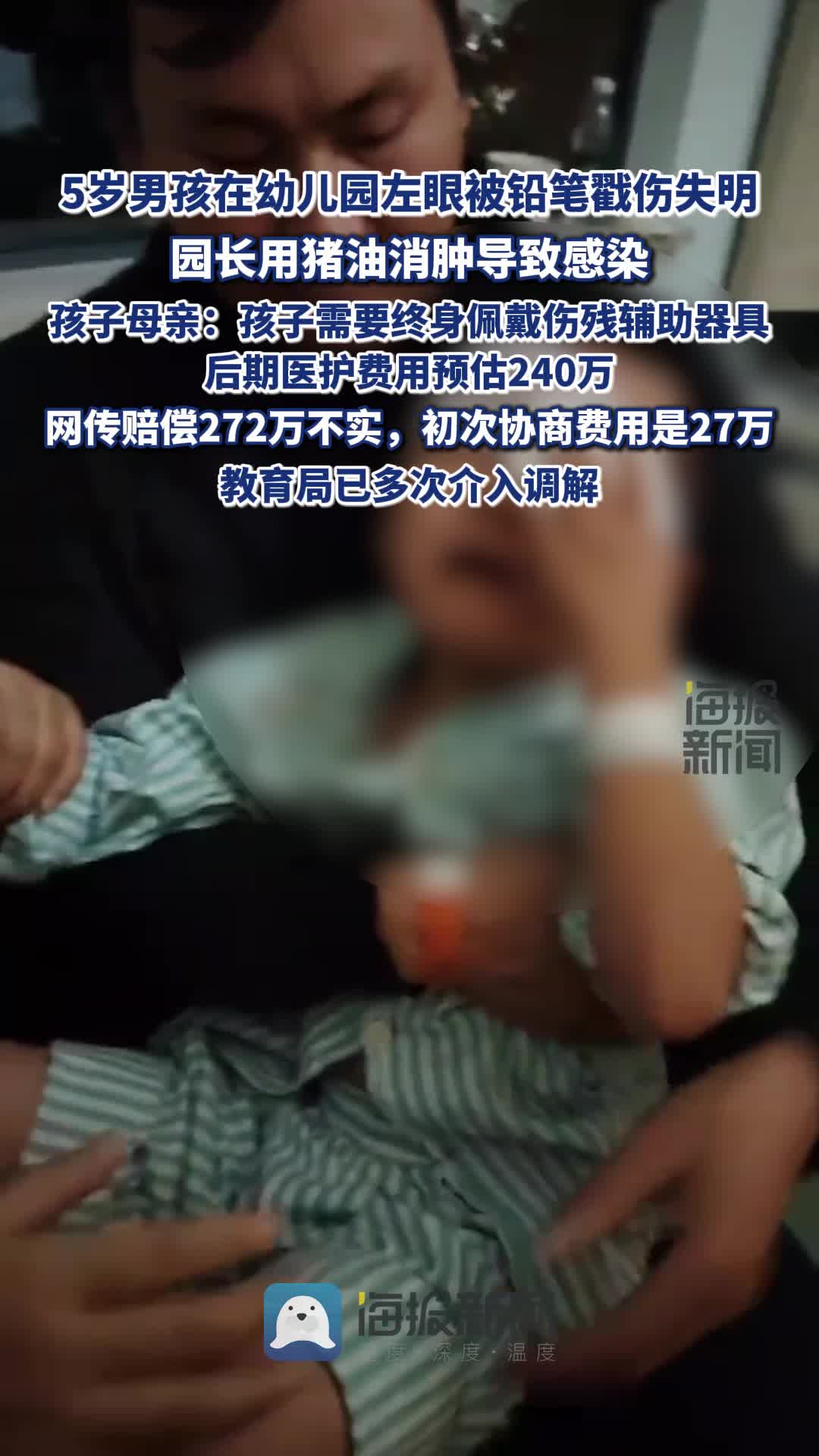 5歲男孩在幼兒園左眼被鉛筆戳傷失明,園長用豬油消腫致感染,孩子母親回應(yīng)“272萬賠償”